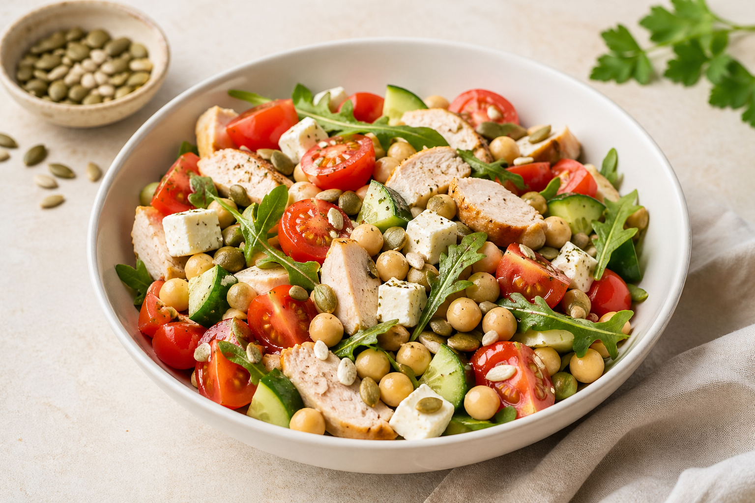 Riche en protéines, en fibres et en bons lipides, cette salade de pois chiches, tomates, feta et poulet rôti est un plat complet, équilibré et rassasiant. Elle apporte une énergie durable, favorise la satiété et constitue une excellente option pour un repas sain, frais et gourmand.